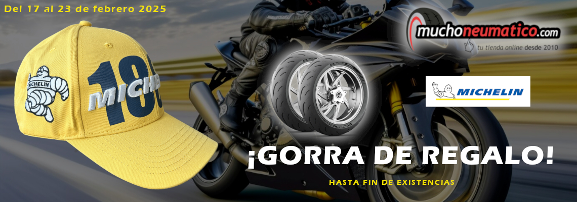 Compra 2 o más neumáticos de moto Michelin del 17 al 23 de febrero y llévate una gorra original Michelin de regalo. No pierdas esta oportunidad de rodar con estilo y calidad. ¡Tu cabeza y tu moto se merecen lo mejor!